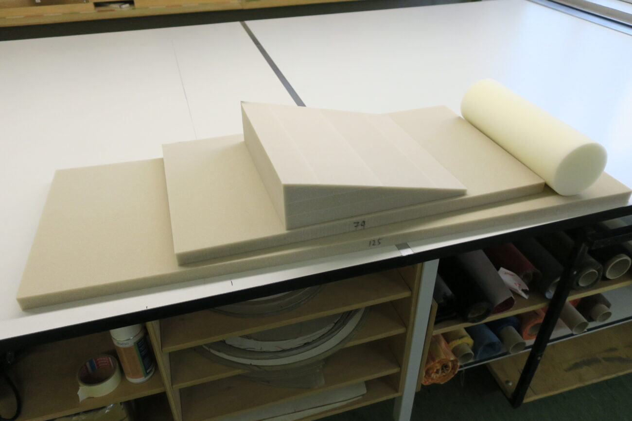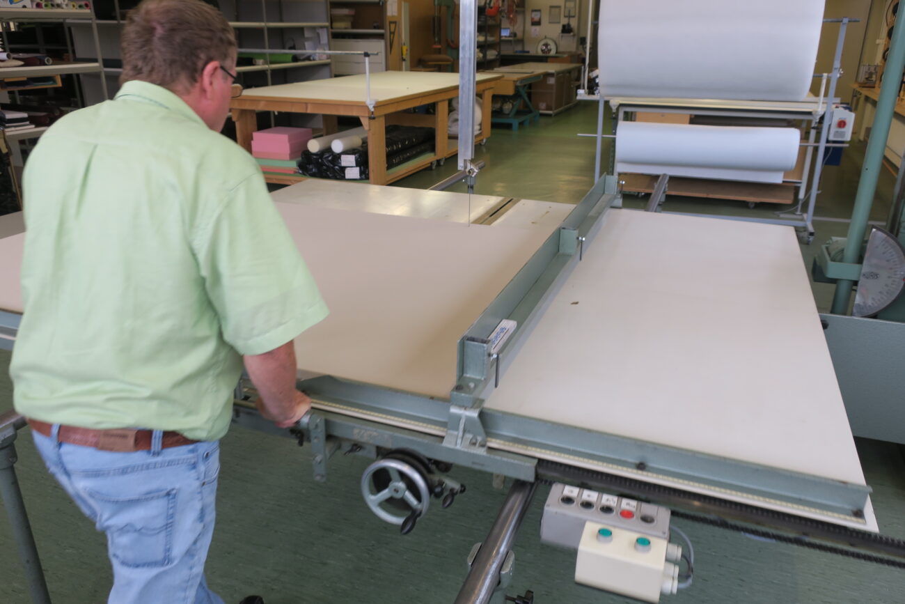 Als wir schon die halbe Firma gesehen haben, gelangen wir zu einer Art Bandsäge mit einem überdimensionierten Tisch. Konzentriert und millimetergenau schneidet Herr Jäger verschiedene Schaumstoffteile damit zu. Hier findet also der erste Arbeitsschritt zu dem statt, was irgendwann einmal eine Sitzauflage in einer «Jenny & Weber»-Infrarotkabine wird. Gleich dahinter steht eine Rolle mit Vlies: Die Schaumstoffe werden damit eingepackt, um den Schaumstoff und den Bezug zu schonen.