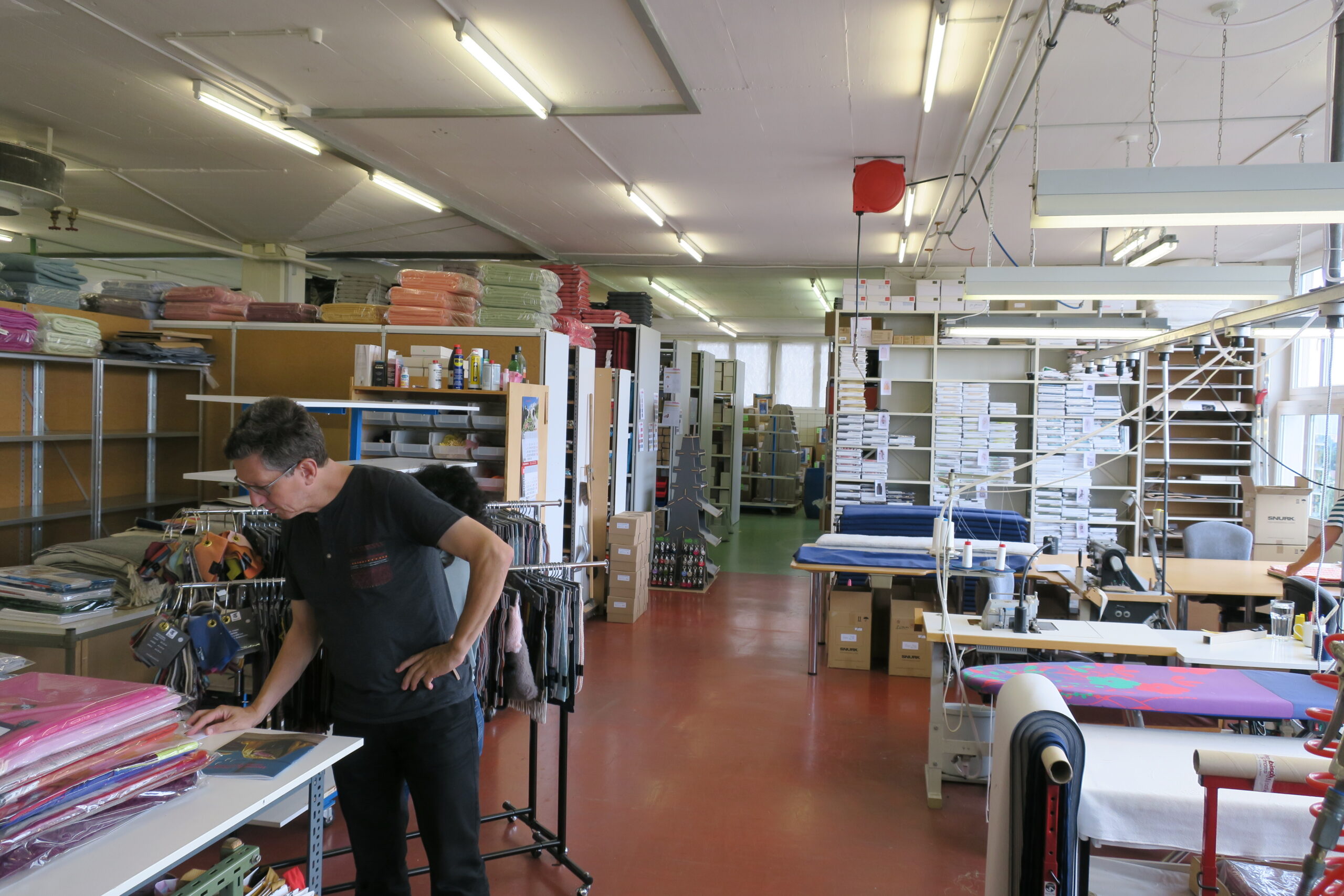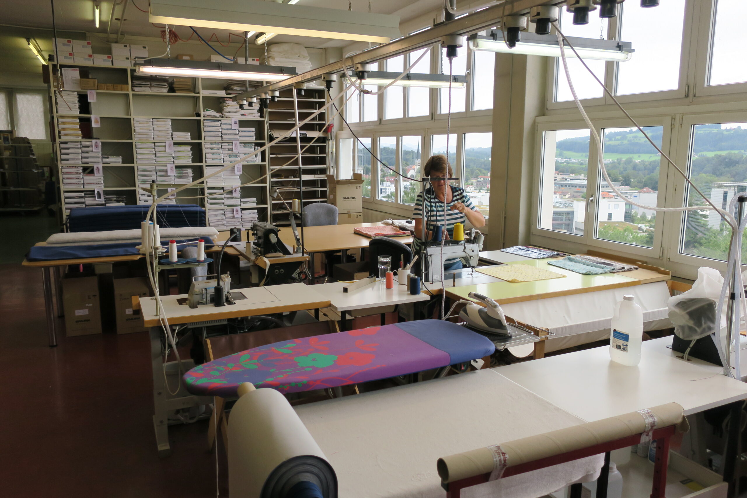 Unscheinbar und fast etwas versteckt liegt das Fabrikgebäude an der Walenbüchelstrasse in St.Gallen. Nichts deutet darauf hin, dass hier noch eine Handwerkskunst von Meistern ihres Fachs ausgeübt wird. Der graue Himmel und Nieselregen über St.Gallen bilden einen herben Kontrast zum farbigen Reich der Bischof-Gross AG, dem Produzenten der Kissen und Fussmatten für unsere Infrarotkabinen. Markus Bischof empfängt uns freundlich und stellt uns sogleich seinem Team vor: «Das sind jetzt eben die mit den Saunakissen», erklärt er lachend – und alle wissen, was gemeint ist.
