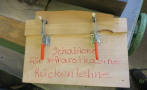 Auch für die Rückenlehnen unserer Infrarotkabinen wird oft mit Schablonen gearbeitet. Das stellt sicher, dass jedes Produkt letztlich gleich wird. So werden zum Beispiel die seitlichen Teile zuerst grob an der Bandsäge zugeschnitten und anschliessend auf eine Vorlage gepresst. Diese Vorlage wird am Fräser entlanggezogen, damit eine perfekt geschwungene Form entsteht. Erstaunlich ist einmal mehr, wie viele einzelne Arbeitsschritte nötig sind: Wer sich im Metier nicht auskennt, ahnt nicht, dass hinter dem Endprodukt ein grosses Stück Feinarbeit steckt.